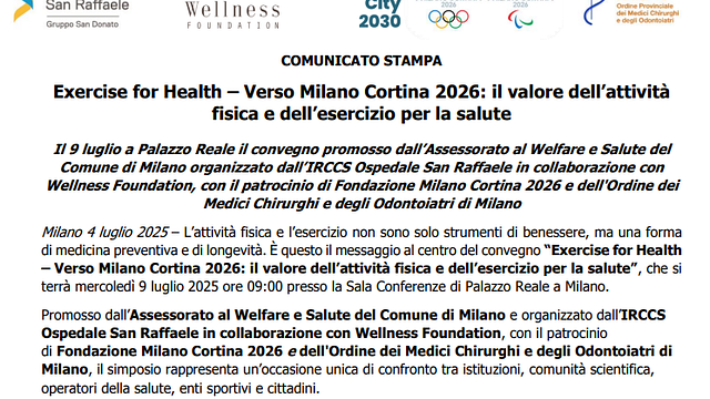 Promosso dall’Assessorato al Welfare e Salute del Comune di Milano e organizzato dall’IRCCS Ospedale San Raffaele in collaborazione con Wellness Foundation, con il patrocinio di Fondazione Milano Cortina 2026 e dell'Ordine dei Medici Chirurghi e degli Odontoiatri di Milano, il simposio rappresenta un’occasione unica di confronto tra istituzioni, comunità scientifica, operatori della salute, enti sportivi e cittadini.