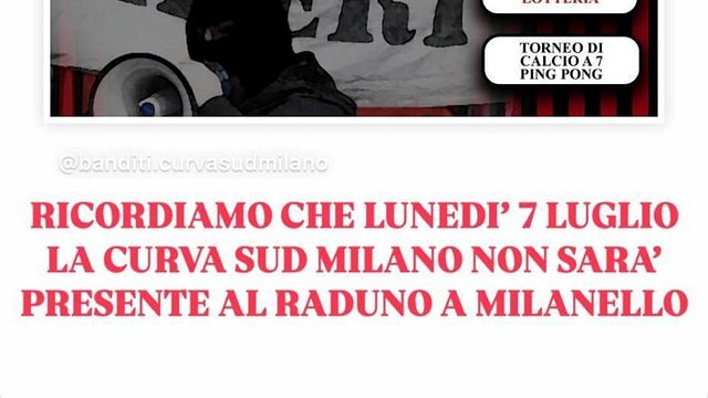 Durante la festa di fine anno, i Banditi della Curva Sud rossonera hanno annunciato che non saranno presenti a Milanello al raduno del Milan che inizia la preparazione per la stagione 2025/26. "Ricordiamo che lunedì 7 luglio la Curva Sud Milano non sarà presente al raduno a Milanello" si legge in una storia Instagram.