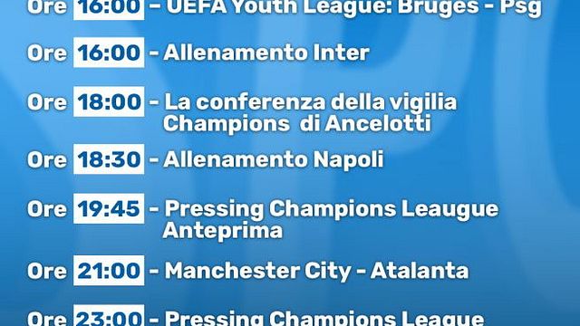 Undici streaming che coprono praticamente tutta la giornata: oggi su Sportmediaset.it scorpacciata di Champions League e Youth League, senza dimenticare gli appuntamenti fissi con il Tg delle 13 e la chat con Sandro Sabatini. Vigilia europea per Inter e Napoli, ecco quindi le conferenze di Conte e Ancelotti (oltre alle rifiniture delle due squadre) che ci accompagnano sino alla diretta di Manchester City-Atalanta, seguita dal post-partita con tutti i gol e le interviste.