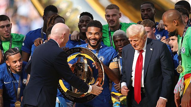 Premiazione del Mondiale per club con Donald Trump protagonista. Al momento di consegnare il trofeo ai vincitori, assieme al n.1 della Fifa Gianni Infantino, il Presidente americano lo ha consegnato nella mani del capitano del Chelsea Reece James, poi è rimasto nel gruppo dei Blues e ha fatto allo stesso James, rimasto per un attimo titubante, un gesto che lo ha invitato a sollevare il trofeo. Così anche Trump è comparso nella foto di gruppo del trionfo dei Blues londinesi.