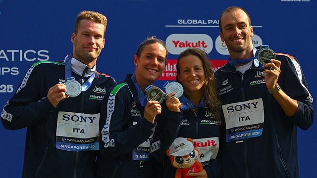 L'Italia si porta a casa un'altra medaglia ai Mondiali di nuoto in corso a Singapore. Stavolta, l'argento arriva nella staffetta mista in acque libere (4x1500m): Barbara Pozzobon, Ginevra Taddeucci, Marcello Guidi e Gregorio Paltrinieri, con il tempo complessivo di 1h09'15"40, chiudono alle spalle della Germania, che domina trascinata da Wellbrock. Battuta l'Ungheria per quasi un secondo e mezzo: non riesce la rimonta finale a Betlehem.