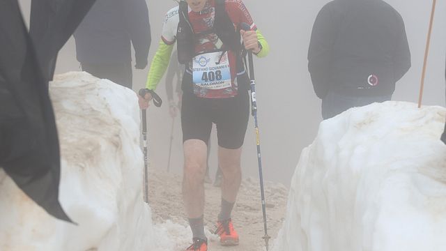 Raggiungo l’intaglio di Forcella Pordoi e l’omonimo rifugio appollaiato lì in posizione panoramica due ore e sei minuti dopo il segnale di partenza, sei soli minuti in più di due anni fa e con ventiquattro minuti di vantaggio sulla “scadenza” della barriera oraria. Mi accontento e penso che di questo passo (letteralmente), posso puntare a farcela per due o tre altre edizioni negli anni a venire. Lo scenario è da Gavia, Stelvio o Izoard: si scollina tra due muretti di neve e nel nebbione. Mi fermo al ristoro, mollo i bastoncini che faranno ritorno alla base in elicottero e mi “precipito” giù per la variante, dopo aver dato una rapida occhiata all’attacco del semigiro ad anello verso la piramide del Piz Boè, senza però vedere nulla e quindi pensando: meglio così, tornerò.