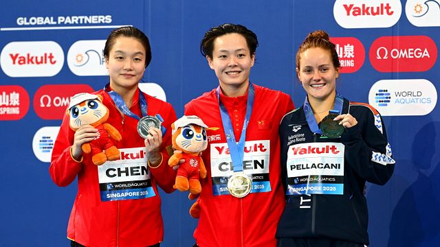 Impresa di Chiara Pellacani, la prima delle "umane" nel trampolino da 3 metri ai Mondiali di nuoto di Singapore. Nell'ennesima finale dominata dalla Cina, che vince l'oro con Jiwen Chen (389.70) e l'argento con Jia Chen (356.40) c'è spazio anche per l'Italia, che sorride grazie alla 22enne in grado di essere la più costante dopo le due inarrivabili. L'azzurra, infatti, è terza dopo la quarta rotazione e anche l'ultimo tuffo le regala un 61.50 parziale che mette pressione a tutte. La tedesca Lena Hentschel, poi quarta, chiude a 321.60 contro il 323.20 dell'italiana. L'unica che potrebbe anticiparla in extremis è l'australiana Maddison Keeney, che però sbaglia tutto: prima interrompe il salto prendendo due punti di penalità, poi fallisce completamente l'ultimo esercizio e alla fine è addirittura sesta con il punteggio complessivo di 310.60.