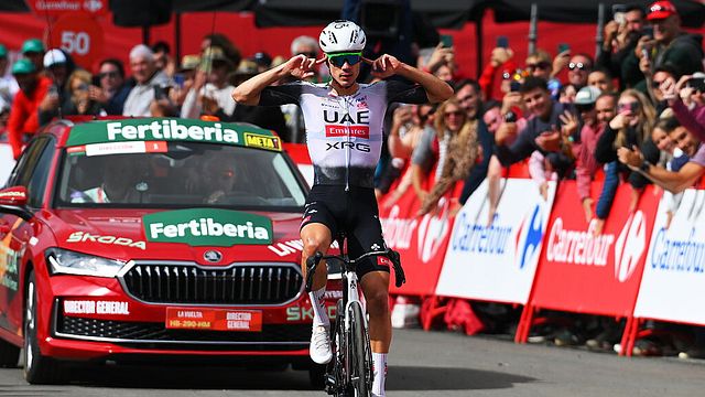 La Vuelta prosegue nel segno della Uae Team Emirates, che ottiene il suo tris di tappe: dopo il successo nella cronosquadre e quello di Jay Vine, questa volta tocca a Juan Ayuso. Lo spagnolo, che era staccato di dieci minuti rispetto al leader, riesce a inserirsi nella fuga e fa il vuoto sulla salita finale: è lui a chiudere con le braccia alzate dopo i 188km da Andorra La Vella a Cerler/Huesca La Magia. Continui saliscendi nella tappa odierna, con quattro ascese: Port del Canto (24.7km al 4.4%), Creu de Perves (5.7km al 6.3%) e La Espina (7.1km al 5.5%) sono il preludio ai 12.8km al 5.8% di pendenza media verso Cerler, con punte al 10%. Si forma subito una fuga di dodici corridori: Ayuso e Vine (Uae), Pedersen (Lidl-Trek), Quinn (EF), Howson (Q36.5), Tejada (Astana), Rolland (Groupama-FdJ), Nicolau (Caja Rural), Garcia Pierna (Arkéa), Vermaeke (Picnic-PostNL), Sepulveda (Lotto) e Frigo (Israel). Il gruppo lascia fare e il vantaggio vola sopra i quattro minuti, visto l'ampio distacco di Ayuso, con uno scenario ben definito: Vine fa incetta di punti nei Gpm per consolidare la maglia a pois, Pedersen conquista quelli per la maglia verde. Si procede così di comune accordo fino alla salita finale, dove Ayuso fa la sua mossa: lo spagnolo fa il vuoto e anche Frigo, che aveva tentato di resistere, si arrende nei km finali. Trionfa dunque Ayuso, che riscatta le crisi dei giorni scorsi e chiude con 1'15" su Frigo e 2'35" sul gruppo, preceduto da Soler (+2'30") e da ciò che rimaneva della fuga. Giornata interlocutoria per i big, con Vingegaard a difendersi dal breve scatto di Almeida. La classifica generale resta così sostanzialmente invariata: il norvegese Traeen (Bahrain), ottimo anche oggi mentre crollavano i suoi capitani Buitrago e Tiberi, guida con 2'33" su Vingegaard e 2'41" su Almeida: dietro di loro Ciccone (+2'42") e Fortunato (+2'47"). Domani si riparte con una tappa per velocisti, nei 163.5km verso Saragozza.
