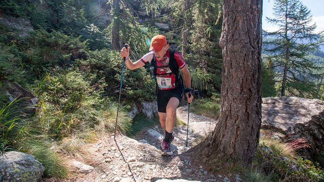 Caldo e fatica si fanno sentire. Il cielo sopra la mia testa è azzurro ma entro (malvolentieri) nella penombra della "pain cave". E non ho neanche portato il frontalino! Mio malgrado mi stacco dai recenti “contatti” e scalo una marcia per evitare il fuorigiri, indugiando anche a bere e rinfrescarmi presso i numerosi torrentelli che caratterizzano questa parte dell’itinerario. La “crisetta” non è superata, c’è da soffrire ancora, visto che la traccia di sentiero si impenna nel tratto che costeggia i laghetti di Campagneda. Tocca spingere forte sui bastoncini. Acquistati solo pochi giorni fa per rimpiazzare LEKI e Cober rottamati uno dopo l’altro alla Dolomyths Run Skyrace di Canazei e alla solita VUT, i miei nuovissimi Black Diamond Distance Carbon Z fanno il loro dovere: maneggevoli e leggerissimi, li metto a riposo sul breve tratto di catene poco sotto il valico, per imbracciarli di nuovo (e per l’ultima volta oggi) nelle facili roccette finali che mi portano ad attraversare con venticinque minuti di vantaggio sul tempo limite delle quattro ore e quindici minuti il cancello orario di Campagneda che in questo caso è tutt’altro che virtuale, assumendo l’aspetto del classico arco ligneo che è uno dei simboli stessi della Skyrace, fin dalle sue prime edizioni eroiche, all’inizio di questo secolo.