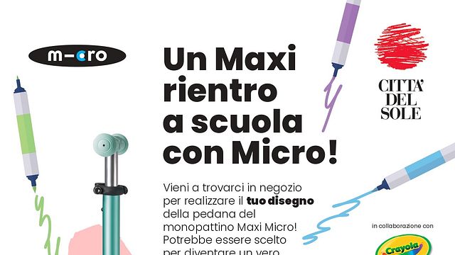L'iniziativa invita i giovani artisti a personalizzare la pedana di un monopattino attraverso disegni e colori unici. Il progetto più creativo e originale verrà selezionato per diventare un autentico Maxi Micro limited edition, che sarà disponibile esclusivamente nei punti vendita Città del sole a partire dall’anno prossimo.