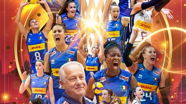 L'Italia ha vinto la medaglia d'oro ai Mondiali di volley femminili. A Bangkok (Thailandia) le ragazze di Velasco hanno bissato il successo ottenuto nel 2002, battendo in una finale equilibratissima la Turchia allenata da Daniele Santarelli per 3-2 (25-23, 13-25, 26-24, 19-25, 15-8). Bravissime le azzurre a non demoralizzarsi di fronte a una Vargas incontenibile (33 punti) e a fare la differenza nel tie-break decisivo con quattro muri di fila, l'ultimo di Sylla (19 punti). Miglior realizzatrice delle azzurre Egonu (22).
