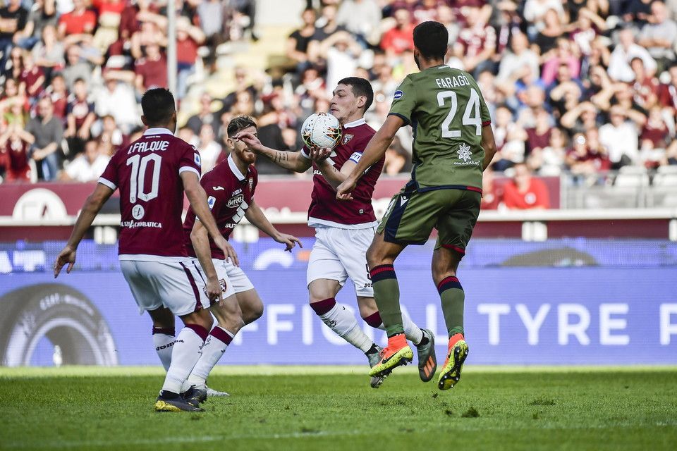 Mazzarri, dopo il solo punto nelle ultime tre partite, rispetta la promessa: in campo va chi ha dimostrato motivazione e tenuta atletica in settimana, anche a costo di presentare qualche sorpresa. E così tra i titolari rispuntano Djidji in difesa e soprattutto Iago Falque, solo 32 minuti in campo in questa stagione, alle spalle di Belotti e di fianco a un Ansaldi alzato in posizione di rifinitore. La scelta paga fino a un certo punto: l'attaccante spagnolo non incide praticamente mai (e rimarrà negli spogliatoi all'intervallo, lasciando il posto a Zaza), l'ivoriano si rende utile murando a Joao Pedro la prima conclusione del match ma poi si fa notare soprattutto per svariate imprecisioni. I granata nella prima fase di partita mantengono autorevolmente il possesso palla, ma non riescono a trovare spazi tra le maglie di un Cagliari attentissimo. E sono anzi gli ospiti a rendersi maggiormente pericolosi, con Joao Pedro che scarica sul fondo uno splendido pallone fornitogli da Faragò. Il Toro si rende quindi pericoloso solo al 37', ma è più demerito di Ceppitelli che scaraventa un pallone addosso a Belotti che bravura del Gallo, che comunque spara il pallone addosso a Olsen. Il gol, meritatissimo, è quindi firmato dal Cagliari: lo segna al 40' Nandez, alla prima marcatura in serie A. L'uruguagio trova l'angolino con un gran diagonale su pallone controllato da Simeone. Nell'occasione è però fin troppo ferma la retroguardia granata.
