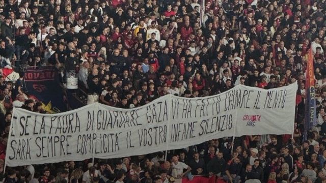 Cinque minuti di silenzio e uno striscione dedicato in Gradinata Nord. I tifosi del Genoa hanno voluto solidarizzare con le proteste per quanto sta accadendo a Gaza durante la sfida di campionato contro la Lazio. I tifosi rossoblù hanno esposto uno striscione: "E se la paura di guardare Gaza vi ha fatto chinare il mento sarà sempre complicità del vostro infame silenzio" a firma Gradinata Nord mentre in un volantino hanno voluto spiegare le ragioni del gesto sottolineando di "non voler politicizzare ma lo stadio" ma anche che "ci sono situazioni che vanno oltre il calcio che toccano nel profondo la coscienza di ciascuno di noi. Non possiamo rimanere indifferenti davanti a ciò che accade in Palestina. Ed è per questo che oggi abbiamo deciso di restare in silenzio i primi cinque minuti della partita ed esporre uno striscione come segno di solidarietà verso il popolo palestinese e per dire chiaro e forte: stop al genocidio".