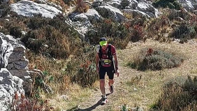 Nel tratto finale del canyon la pendenza si addolcisce notevolmente: girovaghiamo cambiando spesso direzione nella rada macchia, fino ad un passaggio su roccia che sfocia in un bel pianoro… o quasi, che però non dura molto. Da qui in avanti e per cinque o sei chilometri, la traccia viaggia a semicerchio in direzione ovest e poi sud verso il principale punto di ristoro. Si corre e più spesso si cammina tra sentieri e grandi lastroni di roccia, tra la rada vegetazione e all’ombra di qualche ginepro isolato, superando una lunga serie di vallette successive: alcune attraversate perpendicolarmente al loro sviluppo, altre percorse per qualche decina di metri lungo il loro asse principale. Una faticaccia insomma, sotto il sole implacabile ma con una temperatura meno alta rispetto allo scorso anno, merito anche della buona ventilazione di questo tratto, che corre intorno ai mille metri abbondanti. A fine gara attribuirò proprio alle condizioni meteo ideali e alla migliore conoscenza (e quindi gestione) del percorso un miglioramento di diciassette minuti sul mio tempo 2024, altrimenti inspiegabile!
