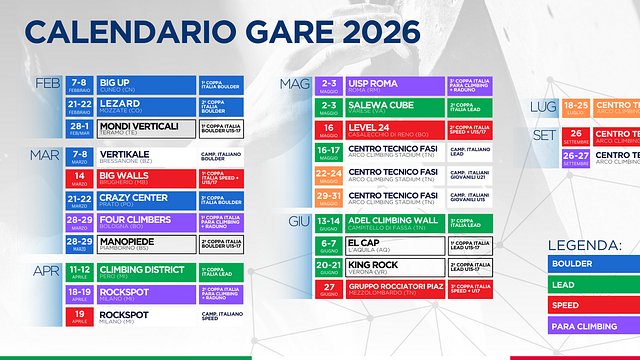 Appuntamenti fondamentali della stagione sono i Campionati Italiani, che attribuiscono gli ambiti titoli di specialità. Il 7-8 marzo si disputerà il Campionato Italiano Boulder a Bressanone (Vertikale), il 19 aprile il Campionato Italiano Speed a Milano (Rockspot), il 16-17 maggio il Campionato Italiano Lead presso il Centro Tecnico FASI ad Arco, infine il 26-27 settembre il Campionato Italiano Para climbing anch’esso ad Arco, che segnerà la conclusione della stagione agonistica 2026.