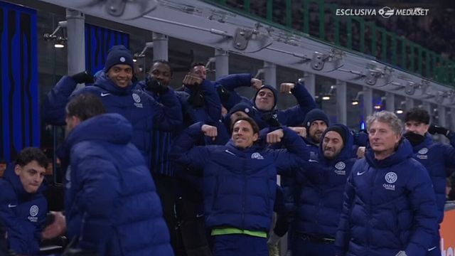 La panchina dell'Inter festeggia Pio Esposito al minuto 79' dell'ottavo di Coppa Italia contro il Venezia, quando Chivu lo richiama e manda in campo al suo posto Spinaccé. I compagni di squadra, da Sommer a Calhanoglu, da Acerbi a Thuram gli mostrano i muscoli, come lui aveva fatto dopo il primo gol con la maglia dell'Inter a San Siro.
