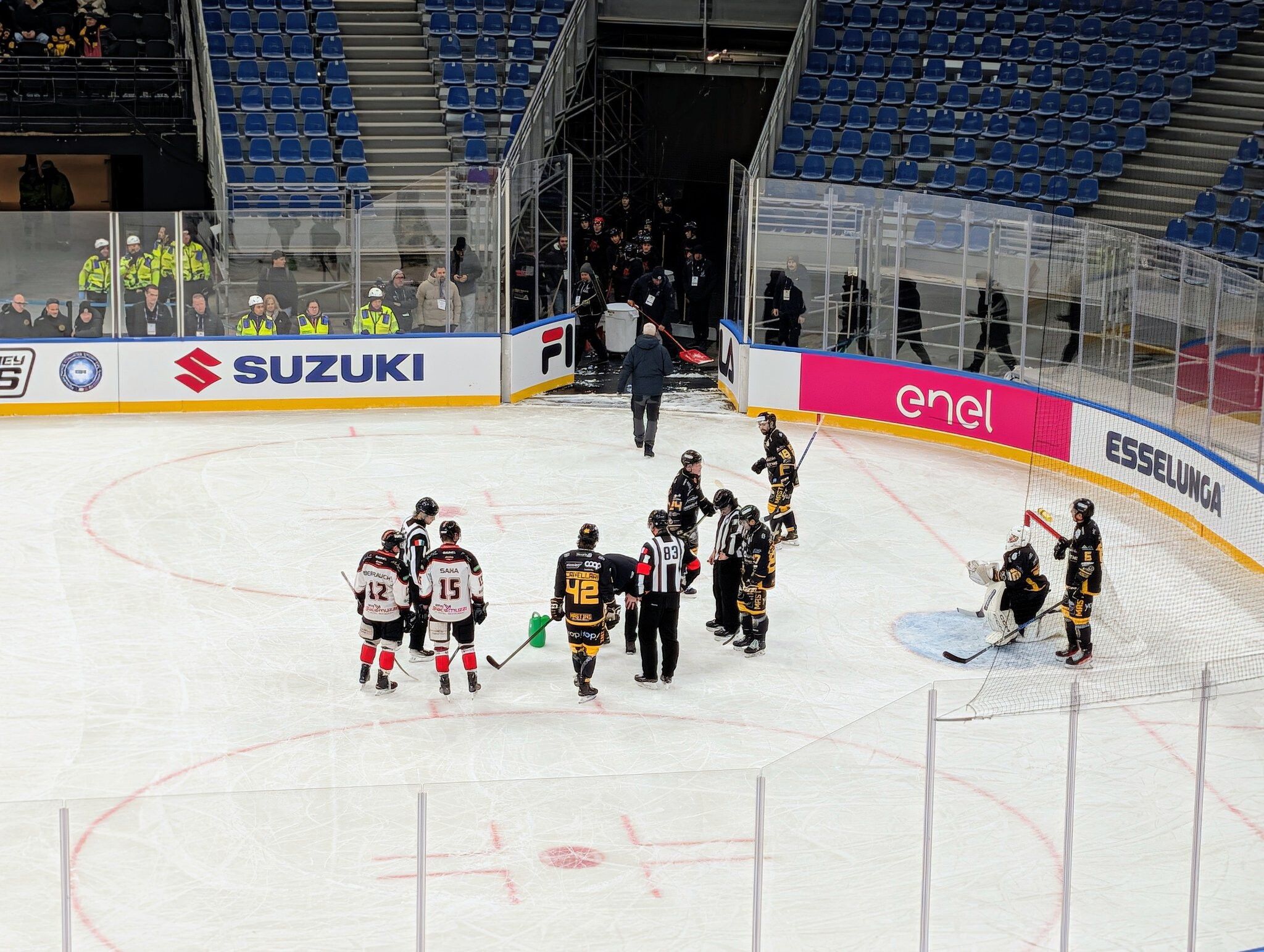 La gara è stata interrotta per diversi minuti nel corso del primo quarto di gioco a causa della formazione di un buco nella superficie ghiacciata. L'imprevisto ha costretto gli addetti ai lavori a un intervento d'emergenza per ripristinare la sicurezza della pista. Una volta risolto il problema, il match è ripreso regolarmente concludendosi con la netta vittoria del Caldaro per 8-3.