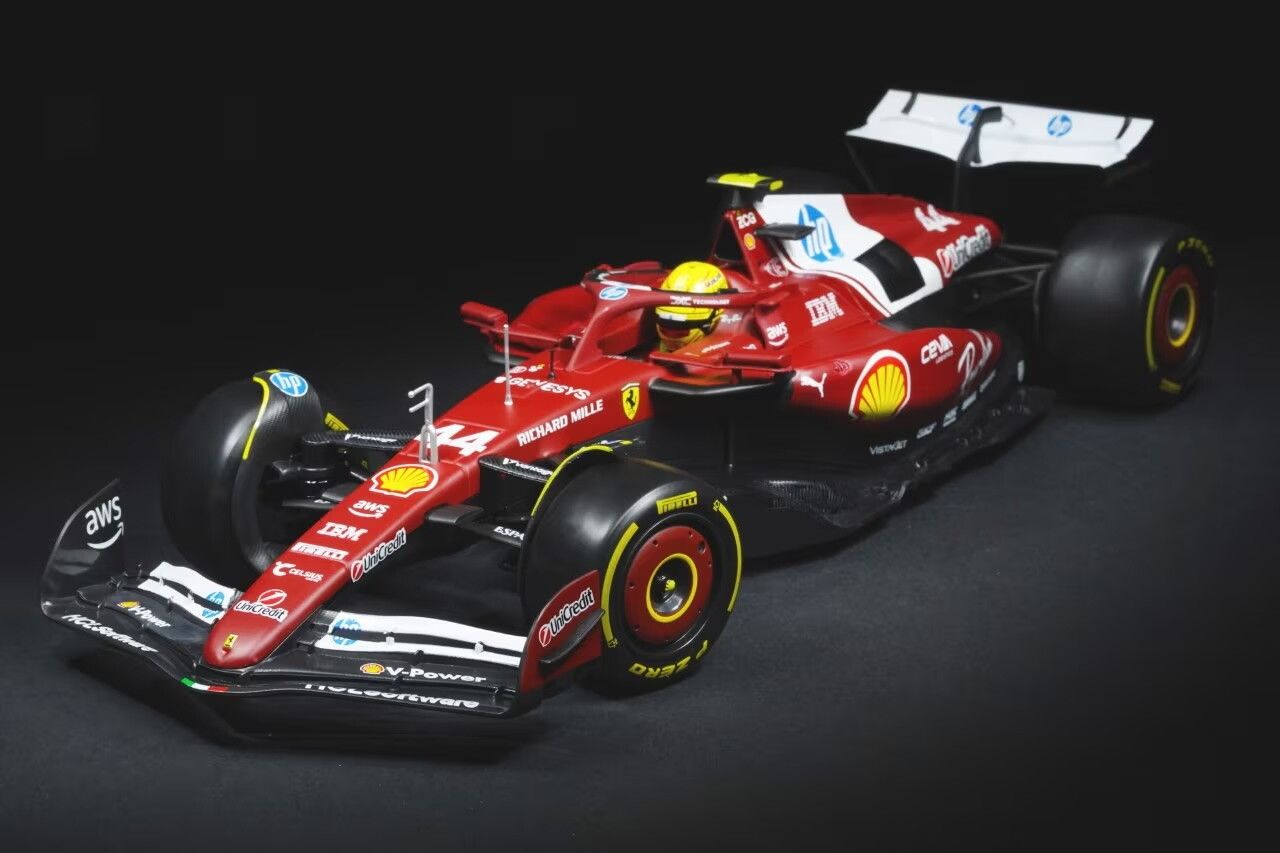 Bburago ha scelto di raccontarlo con la SF25 numero 44 in scala 1:18, realizzata con licenza ufficiale Ferrari. Una replica che punta sull’impatto visivo: rosso pieno e brillante, contrasti neri sul fondo, sponsor nitidi anche nelle superfici più articolate. Il numero 44 domina muso e fiancate, mentre il casco giallo di Lewis Hamilton aggiunge personalità all’insieme. La monoposto riproduce le proporzioni della vettura 2025 con pance scolpite e rastremate, ala anteriore multilivello ben separata nei profili.
