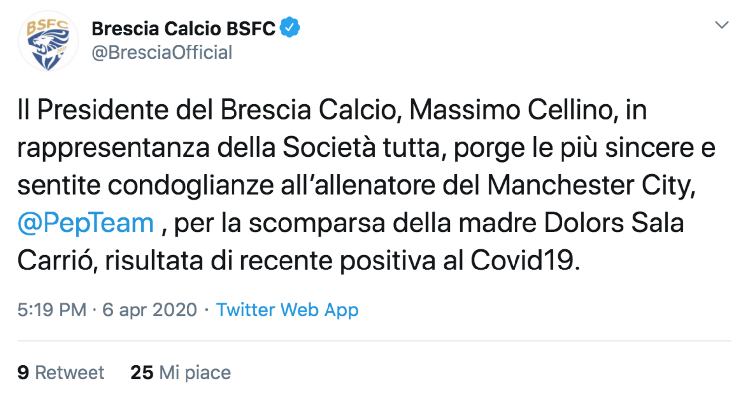 I grandi del calcio europeo si stringono attorno a Pep Guardiola dopo l'annuncio della morte della madre, risultata positiva al coronavirus. Non solo le sue squadre "del cuore", come Brescia e Barcellona, ma anche rivali storiche, come Real Madrid e Manchester United, hanno fatto sentire la loro vicinanza al tecnico catalano in un momento di lutto.