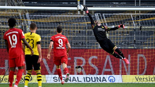 Primo tempo scoppiettante al Signal Iduna Park. Dopo appena 30 secondi dal fischio d’inizio c’è subito un’occasionissima per i padroni di casa: su un’uscita spericolata di Neuer, Haaland raccoglie il pallone e lo fa passare sotto le gambe del portiere tedesco con un destro rasoterra debole e Jerome Boateng sventa il pericolo a pochi passi dalla linea di porta. Al 4’ ancora gialloneri vivaci, quando Guerreiro, imbeccato sulla sinistra, appoggia sapientemente a rimorchio per Brandt, che apre il piattone da posizione defilata ma è facile la presa per Neuer, che blocca in due tempi. Sul fronte opposto si fanno vedere per la prima volta i bavaresi: Lewandowski cerca il palo più lontano, da posizione proibitiva; Burki blocca in allungo. Sul primo vero grande assalto del Bayern al 20’, brivido per la difesa del Dortmund: Coman serve nell’area piccola Gnabry, che ha tutto il tempo di controllare il pallone e calciare a botta sicura, ma è provvidenziale il salvataggio sulla linea da parte di Piszczek, che si oppone alla conclusione dell’ex Hoffenheim a portiere battuto. Tre minuti più tardi è Coman a scaldare i guantoni di Burki, che respinge coi pugni il destro potente ma centrale del centrocampista della Nazionale francese. Dopo un quarto d’ora di sofferenza, il Borussia si fa rivedere in zona offensiva, perché Haaland vince il duello in velocità con Alaba, ma annaspa sul rientro prodigioso di Alphonso Davies, che riesce a soffiargli il pallone.