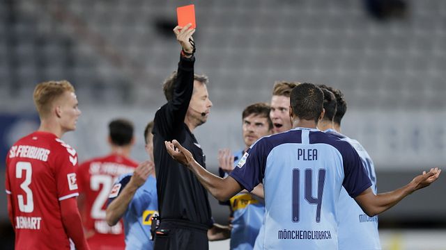 C'è quasi solo il 'Gladbach nel primo tempo. Con le loro combinazioni palla a terra, gli uomini di Marco Rose nascondono il pallone alla difesa del Friburgo, che va in apprensione già al quarto d'ora: Stindl imbecca Plea, il tiro di quest'ultimo è respinto con i piedi dal portiere Schwolow, che poi si ripete sullo stesso Stindl. In precedenza l'estremo difensore aveva ribattuto un tentativo da 30 metri del gioiellino Neuhaus, sempre con il piede caldo. Quando invece serve la freddezza, come al 26', le idee si annebbiano e un gol di Herrmann praticamente fatto (la porta è vuota) viene annullato per fuorigioco perché il centrocampista si trova sulla traiettoria del tiro e anzi devia il pallone senza che ce ne sia bisogno. La serata storta di Neuhaus prosegue 11 minuti più tardi: una preziosa sponda aerea di Stindl viene buttata al vento da un pallonetto largamente fuori misura a cinque metri dalla porta. Meno dannoso, ma anche meno attivo, è Thuram, che non ripete l'ottima prestazione ammirata contro l'Union Berlino. Il Friburgo si sveglia nel finale della prima frazione: Sommer è attento su un destro potente di Holer. Per il resto il portiere del Borussia aveva rischiato solo su un sinistro alto di Waldschmidt (ancora deludente, altro giocatore rispetto a quello ammirato nell'Europeo Under 21 del 2019).