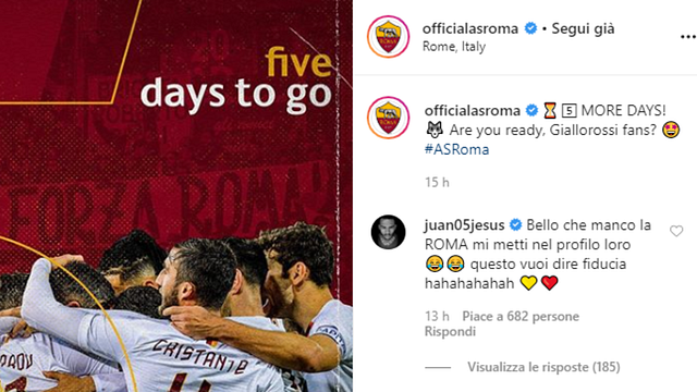 Sembra ormai ai ferri corti il rapporto tra Juan Jesus e la Roma. Il difensore brasiliano ha trovato pochissimo spazio in questa stagione e la sua frustrazione è emersa anche sui social, con un messaggio che se da un lato può essere letto come una semplice battuta, dall'altro non può non far trasparire una certa nota polemica. Il club giallorosso ha scelto di scandire l'avvicinamento alla sfida contro la Samp del 24 giugno pubblicando sul suo profilo Instagram un countdown simboleggiato dai numeri di maglia dei giocatori: foto di Dzeko a 9 giorni dalla partita, poi di Perotti, Pellegrini, Smalling...ma venerdì, giorno del -5, è apparsa una foto di gruppo e non di Juan Jesus. "Bello che manco la Roma mi metta sul suo profilo - ha commentato - Questo vuol dire fiducia...".