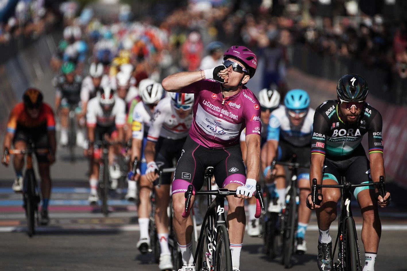 Si arriva così nella città pugliese sull’Adriatico a ranghi compatti, con la Groupama che lavora nel migliore dei modi per Demare: l’ultimo gregario a lanciarlo è Jacopo Guarnieri, poi fa tutto la maglia ciclamino, con una progressione che non lascia scampo a Peter Sagan e Michael Matthews, che non possono far altro che accontentarsi di un piazzamento. Deludente la volata dei velocisti italiani: solo settimo Davide Ballerini (Deceuninck-Quick Step), decimo Elia Viviani (Cofidis). Non cambia nulla in classifica generale: Joao Almeida, compagno di squadra di Ballerini, resta in maglia rosa, con 43” su Pello Bilbao (Bahrain-McLaren) e 48” su Wilco Kelderman (Sunweb). Vincenzo Nibali (Trek-Segafredo) resta il primo degli italiani: è quinto con 1’01” da recuperare sul portoghese.