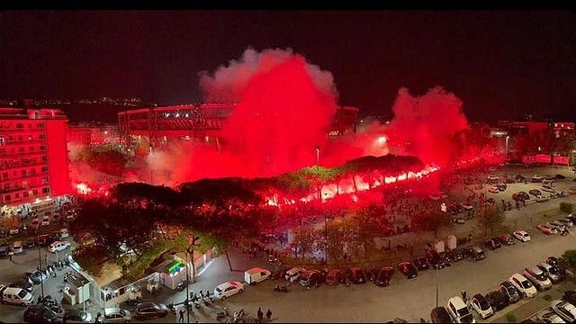 Proprio migliaia di tifosi azzurri si sono ritrovati per tutta la giornata all'esterno dello stadio e hanno acceso fumogeni cantando in onore e ricordo di Maradona.