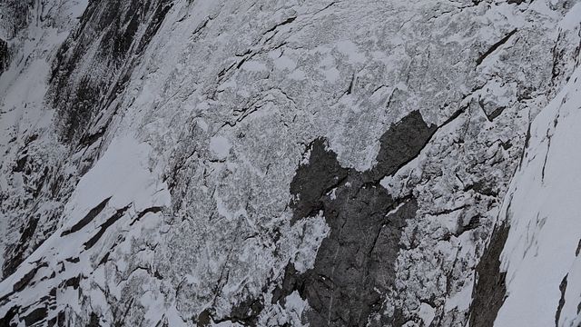Combinazione di vie esistenti sulla parete nord-est del Pizzo Badile in condizioni invernali. La prima parte della via segue un lungo traverso “inedito” (a conoscenza nostra) mentre la seconda parte segue la via “Linea bianca”.