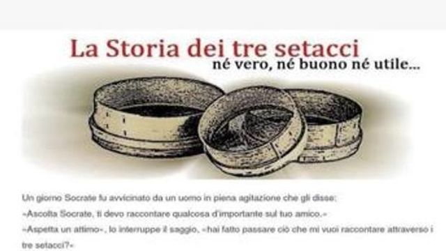 'Sì mio caro, vediamo se ciò che mi vuoi raccontare passa attraverso i tre setacci. Il primo setaccio è quello della verità: sei convinto che tutto quello che mi vuoi dire sia vero?'.