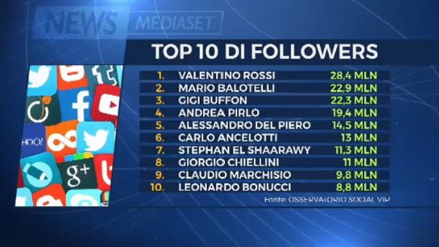 Questo è il risultato di uno studio fatto dall'osservatorio social vip e che conteggia i follower totali tra Facebook, Instagram e Twitter. Valentino, come ha fatto spesso in carriera, vince per distacco con 28,4 milioni davanti a Mario Balotelli, fermo a 22,9, che continua ad attirare attenzione anche dopo essere sceso di categoria firmando per l'ambizioso Monza in Serie B. Sul podio Gigi Buffon, che capeggia una nutrita pattuglia di juventini, attuali o ex, con ben sette nei primi dieci.