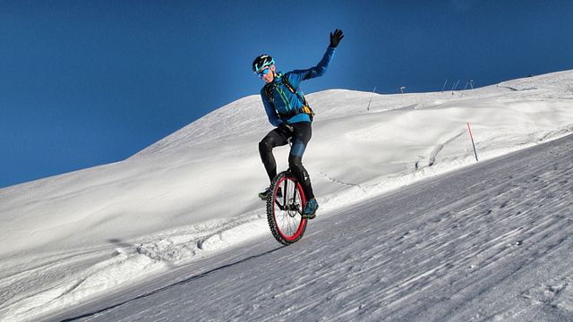 Qualche pedalata d’assetto, con una mano davanti alla sella, dov’è posizionato l’unico freno - a disco - del mezzo meccanico e l’altra a volteggiare nel cielo alla ricerca dell’equilibrio. Un costone esposto alla bellezza della catena alpina, poi giù per la pista normalmente riservata agli sciatori. Ma non questa volta, non questo inverno. Un primo cambio di pendenza, la neve che regge discretamente bene, poi è la volta di una seconda gobba che immette in una sezione più ripida e quindi nel piano. Ogni tanto un tratto di neve riportata dal vento blocca la ruota chiodata e Marco deve saltare giù con i riflessi di un gatto, pronti, quelli di chi quella situazione l’ha già sperimentata più volte. Poi di nuovo in sella, con la solita mano destra a frenare e la sinistra “stabilizzatrice” a mulinare nell’aria come in un rodeo western. Altro muretto, questa volta nell’ombra della montagna, mentre tutt’intorno le vette brillano di una luce riflessa, seguito dal ritorno in pieno sole: quello che si sta godendo un gruppo di ciaspolatori che, incrociando il cammino del nostro “performer”, gli urlano il loro stupore e la loro ammirazione. Siamo ormai al traguardo. Là dove partono – una a fianco dell’altra - la telecabina dalla cui stazione d’arrivo Marco era partito, ed una seggiovia esaposto, entrambi “spente”. Un ultimo sguardo verso la montagna appena scesa e via, monociclo in spalla, con i pensieri già proiettati verso la prossima avventura.