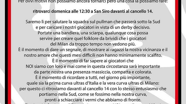 Mancano solo tre giorni al derby di Milano e la febbre in città sale per uno scontro al vertice che da tempo mancava e che carica i tifosi entusiasmanti dal duello per la vetta del campionato. A San Siro il match sarà a porte chiuse, ma gli ultras delle due squadre, nonostante il divieto di assembramenti, vogliono comunque far sentire il proprio supporto ai giocatori, vivere l'attesa e la palpitazione della super sfida e si sono dati appuntamento tramite comunicato stampa.