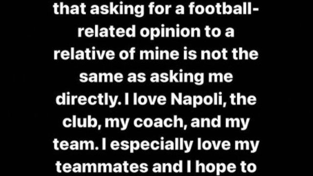 "Desidero chiarire che chiedere un'opinione relativa al calcio a un mio parente non è la stessa cosa che chiedermelo direttamente – ha scritto - Amo il Napoli, il club, il mio allenatore e la mia squadra. Amo soprattutto i miei compagni di squadra e spero di continuare a crescere e migliorare per aiutarli ancora di più. Questa è la mia opinione ufficiale e vi chiedo di rispettarla… nessuno è il mio portavoce o altro."