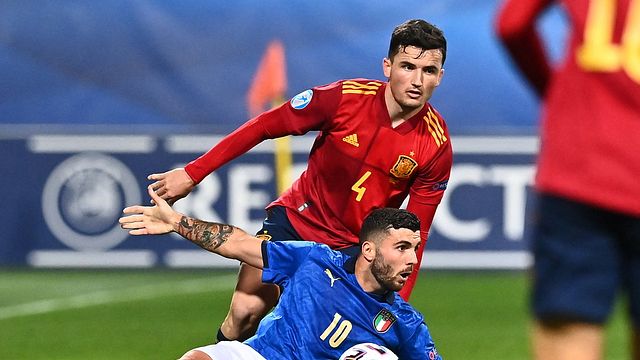 Come con la Repubblica Ceca, l'Italia cede al nervosismo dopo una partita bloccata e, pur mantenendo imbattibilità e porta inviolata, si complica la vita in vista della qualificazione ai quarti di finale dell'Europeo Under 21. A Maribor, gli Azzurrini partono bene, ma la prima occasione è per la Spagna, con Miranda che al 20' ci prova con il sinistro dal limite ma non inquadra lo specchio della porta per questione di centimetri. Stessa sorte, sponda italiana, per Pobega, che avanza verso la porta e ci prova con un mancino che è, però, privo di pericolosità. Al 30', ecco l'azione più importante della formazione di Nicolato, con Frattesi che sfrutta uno dei rari errori in fase di impostazione della retroguardia spagnola e calcia con il destro, ma Alvaro Fernandez riesce a deviare la potente conclusione del centrocampista del Monza quel tanto che basta per mandare la sfera sulla traversa.