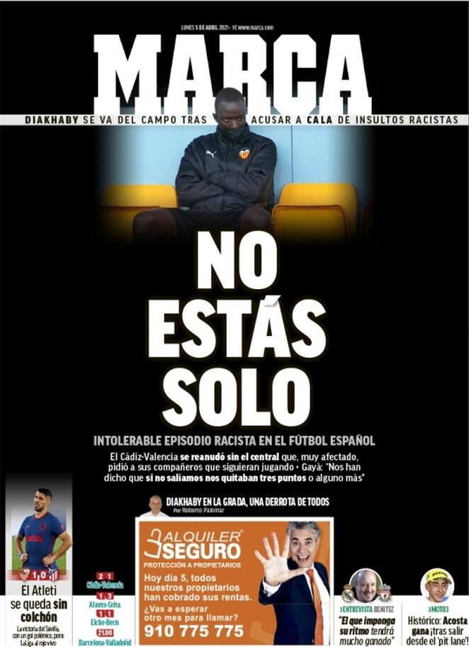 "Cala mi ha detto negro di m...", questo la frase pronunciata da Diakhaby mentre prendeva la via dello spogliatoio durante Cadice-Valencia seguito poi dai suoi compagni di squadra. Episodio che ha indignato la Spagna e il mondo tanto che Marca titola: "Sconfitta di tutti, non sei solo". Nella serata di ieri è arrivato anche il comunicato del Cadice che ha condannato l'episodio.