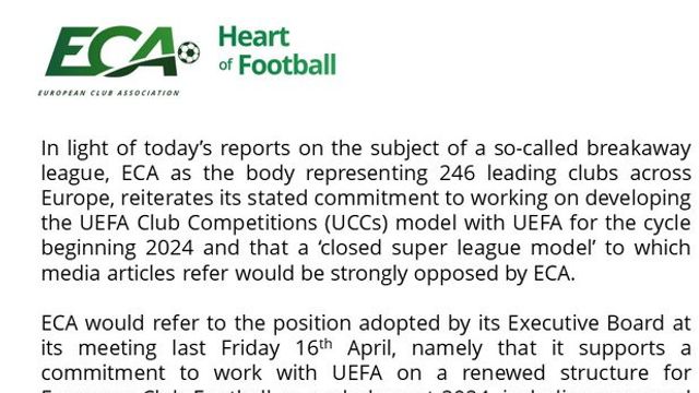 L'ECA, l'associazione dei club europei di calcio, ha emesso un comunicato riguardante le voci della prossima nascita di una Superlega voluta e creata da 12 squadre tra cui Juventus, Inter e Milan, in cui ha espresso la propria opposizione all'idea e il proprio coinvolgimento con la Uefa per la ristrutturazione, a partire dal 2024, delle competizioni europeo. "L'ECA si porrà con decisione contro quella a cui i media si riferiscono come Superlega a numero chiuso" si legge.
