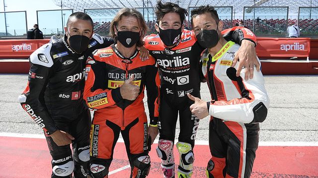 Aprilia ha festeggiato il 25 aprile (e la propria storia) sulla pista amica di Misano, con tanto di scia verde-bianco-rossa stile Frecce Tricolori. L'occasione di rivedere in pista - non ancora dal vivo, purtroppo - i campioni che hanno vinto gare e titoli con la moto italiana nei Gran Premi e nel Mondiale Superbike e, in prospettiva, l'attesa per il prossimo test di Andrea Dovizioso in sella alla promettente RS-GP attualmente affidata nella Premier Class ad Aleix Espargarò e Lorenzo Savadori.