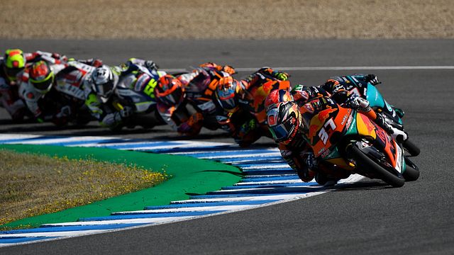 Non c'è due senza tre per Pedro Acosta, che anche a Jerez fa la voce grossa conquistando la tripletta di successi di fila all'esordio nella categoria Moto3. Prestazione da re per il rookie, sempre più leader del mondiale, capace di approfittare di qualsiasi sbavatura degli avversari. In gran parte della gara in duello con il compagno di box Masia e nel finale con l'avversario del team satellite (KTM Tech3) Oncu, lo spagnolo si fa beffe dei due che si stendono a vicenda nelle curve finali, nelle quali a godere e sorridere per il podio è anche Romano Fenati. Ottima prestazione dell'italiano del team di Max Biaggi, bravo a imporsi nel gruppo davanti sin dalle prime curve.