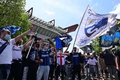 Primi tifosi interisti davanti allo stadio di San Siro a Milano sotto la Curva Nord. I supporters stanno aspettando la formazione di Antonio Conte che alle 18 giocherà contro la Sampdoria: sono previsti 3mila tifosi che, con mascherina e osservando le disposizioni anti Covid, saluteranno la squadra, campione d'Italia già dalla scorsa settimana.