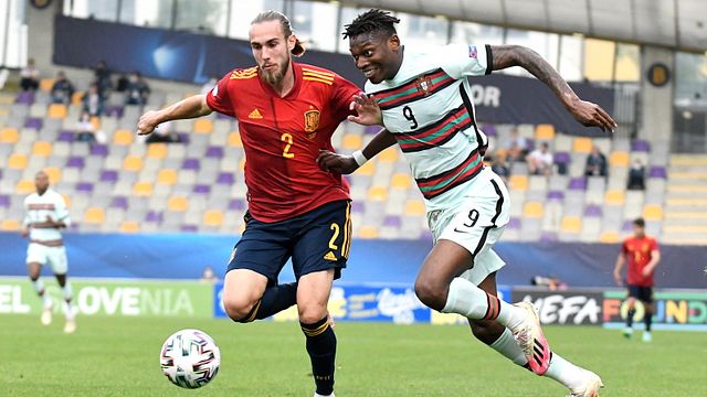 Il Portogallo raggiunge per la terza volta nella sua storia la finale dell'Europeo Under 21 grazie ad una prova cinica, testimoniata dall'1-0 alla Spagna. Nel caldo pomeriggio di Maribor, partono meglio le Furie Rosse che, grazie al fraseggio, riescono a mettere in difficoltà i lusitani, più votati al calcio fisico, veloce e verticale. La tensione di una semifinale è palpabile e, sebbene alcuni dei giocatori in campo calchino palcoscenici più importanti (tra cui i milanisti Brahim Diaz e Rafael Leao), la fase di studio si prolunga per più di quanto ci si aspettasse: lo 0-0, infatti, resiste all'intervallo. Nella ripresa, però, scende in campo un'altra Spagna, che colleziona azioni da gol in serie, la più nitida delle quali è il palo colpito dopo meno di un minuto di gioco da parte del capitano Cucurella con una botta dalla distanza. Il Portogallo, meno brillante rispetto alla gara con gli Azzurrini, attende e prova a ripartire. Nonostante la partita molto complicata, i lusitani passano in vantaggio all'80': in una delle poche verticalizzazioni della squadra di Rui George, la difesa Roja si fa sorprendere e la deviazione di Cuenca sul tiro di Vieira, scattato sul filo del fuorigioco, beffa Fernandez: autorete. L'assalto finale non mette in difficoltà la difesa del Portogallo, che si qualifica per la finale: proverà a vincere l'Europeo Under 21, mai messo in bacheca.