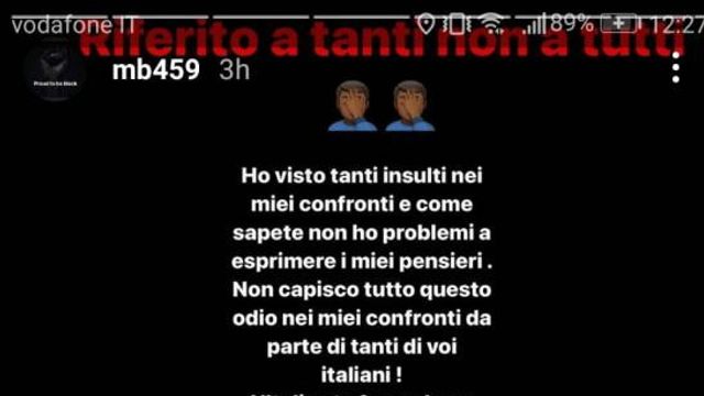 "Ho visto tanti insulti nei miei confronti e come sapete non ho problemi a esprimere i miei pensieri. Non capisco tutto questo odio nei miei confronti da parte di tanti voi italiani! L'Italia sta facendo un grande Europeo. Io non ci sono perché i ragazzi in questi anni hanno meritato più di me la convocazione ma con questo a cosa serve scrivermi: "sei scarso", "stai a casa", "non vali niente", "non sei italiano"... Ci avete mai pensato che il Mondiale è un torneo difficile da conquistare per me ma non impossibile? E cosa dovrei dire se dovessi meritarlo? No, non mi riconosco in voi quindi addio Nazionale? Pensate prima di scrivere: non si sputa mai nel piatto dove si è mangiato. Comunque, ora, forza Italia tutti insieme", queste le parole di Balotelli.