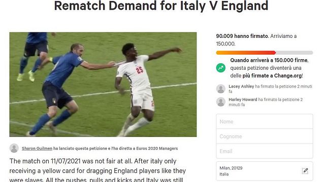 "Il match dell'11 luglio non è stato corretto, dopo che l'Italia ha trascinato i giocatori inglesi come fossero schiavi. Tutte quelle spinte, quelle strattonate e quei calci ed è stato permesso all'Italia di vincere lo stesso? Decisamente di parte. L'Italia avrebbe dovuto ricevere un cartellino rosso per il modo in cui ha giocato e la ripetizione dovrebbe essere arbitrata da un fischietto non di parte. Tutto questo non è stato giusto": la descrizione, sconclusionata, lascia adito anche alla possibilità che tutto faccia parte del proverbiale british humor. Ma intanto oltre 90.000 firme e qualche commento fanno pensare che c'è chi ci crede veramente...