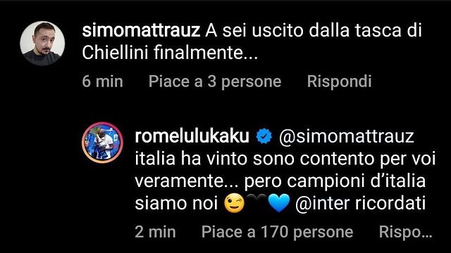 Dopo l’eliminazione del Belgio da Euro 2020 Romelu Lukaku è in vacanza, ma in testa ha solo l’Inter e si allena costantemente per farsi trovare pronto all’inizio della nuova stagione. Big Rom ha postato sul proprio profilo Instagram alcuni scatti dell’allenamento odierno e un tifoso nei commenti l’ha provocato: “Sei uscito dalla tasca di Chiellini finalmente...”. L’attaccante nerazzurro ha accettato la sfida e ha acceso subito gli animi del derby d’Italia: “L’Italia ha vinto e sono contento per voi, veramente. Però i campioni d'Italia siamo noi, ricordatelo".
