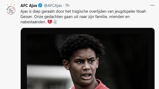 I colori e il comunicato dell'Ajax sono stati costretti nuovamente a raccontare di un tragico lutto. Il mondo dei Lancieri è infatti stato scosso nei giorni scorsi dalla prematura scomparsa di Noah Gesser, promettente 16enne delle giovanili. Il ragazzo ha perso la vita mentre si trovava in macchina con il fratello, anche lui deceduto in un incidente stradale. "I nostri pensieri vanno alla famiglia, agli amici e ai parenti" il ricordo dell'Ajax. La squadra olandese ha disputato l'amichevole contro il Lipsia con il lutto al braccio.