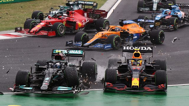Succede appunto tutto alla prima staccata: sull'asfalto umido Bottas (scattato male al semaforo ed infilato all'interno da Norris) tampona la McLaren del britannico che non riesce ad evitare di colpire la Red Bull di Verstappen, mentre lo stesso Bottas "fa fuori" l'altra RB16B di Sergio Perez. Subito dietro Leclerc viene centrato dall'Aston Martin di Lance Stroll, incontrollabile sull'erba bagnata all'interno della prima curva: inevitabile conclusione di una manovra sconsiderata da parte del pilota canadese.