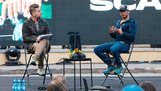“Stasera fa freddo come a settembre inoltrato”: la saggezza popolare dei locals non ci scalda più di tanto ma non importa. Sembra quasi che la tarda estate alpina abbia deciso di “apparecchiarci” un clima… consono al "talk" (moderato da Daniele Bossari) ma soprattutto al racconto che Nirmal farà della sua collezione-record del 2019 e della “prima” invernale assoluta dei dieci alpinisti nepalesi sul K2. Un paio d’ore ad altissima intensità nella location che - agli... antipodi della stagione calda rispetto ad ora - ospita linea di partenza ed arrivo della Lavaredo Ultratrail, l'ormai mitica LUT. Meglio però non divagare e tornare sul palco dove campeggiano gli scarponi con i quali il "nostro" ha raggiunto la vetta del K2: i fantascientifici Scarpa Phantom 8000 HD che lo stesso Nirmal ha contribuito a sviluppare, con il suo feedback (direttamente dal campo... base!) agli uomini dell'azienda veneta di Asolo.