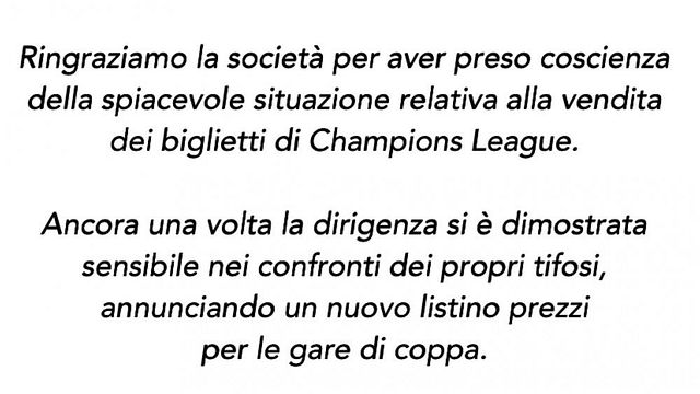 Dopo la lettera di Gazidis ai tifosi del Milan in relazione alle proteste per l'aumento dei prezzi dei biglietti delle gare di Champions, arriva a stretto giro di posta la replica della Curva Sud. "Ringraziamo la società per aver preso coscienza della spiacevole situazione relativa alla vendita dei biglietti di Champions League - si legge in un comunicato dei supporter rossoneri -. Ancora una volta la dirigenza si è dimostrata sensibile nei confronti dei propri tifosi, annunciando un nuovo listino prezzi per le gare di coppa. Sempre con il Milan nel cuore".