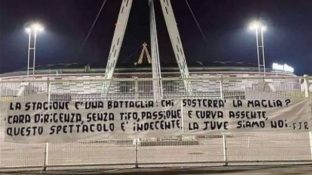 "La stagione è una battaglia: chi sosterrà la maglia? Cara dirigenza, senza tifo, passione e curva assente, questo spettacolo è indecente. La Juve siamo noi". Un striscione firmato FJR e condiviso su Instagram dalla Curva Sud Juventus 1897.