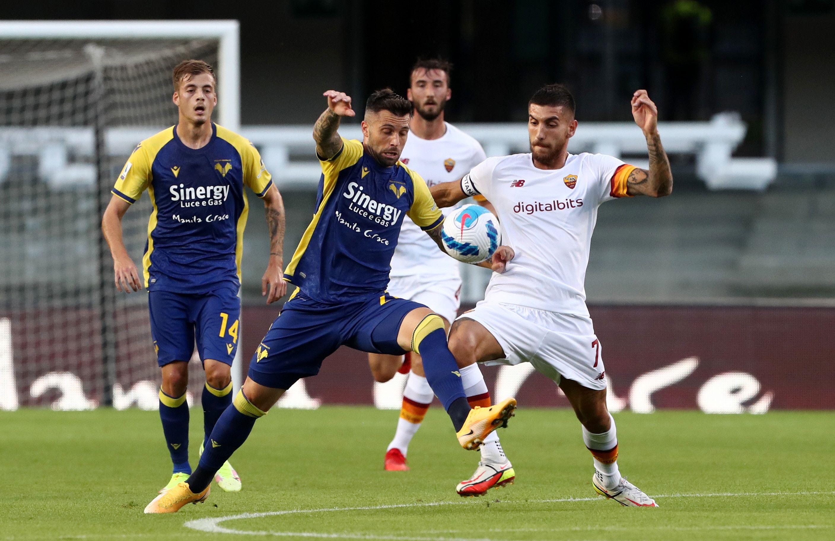 Il portoghese preferisce Shomurodov a El Shaarawy per la fascia sinistra, mentre Tudor per la sua prima formazione lancia un po' a sorpresa Bessa dal 1'. Il match inizia con grande intensità, ritmi alti da entrambe le parti, ma anche parecchi errori tecnici dettati da un po' troppa frenesia. La prima buona chance è sul destro di Simeone, che incrocia splendidamente dal limite dell'area e sfiora il palo alla destra di Rui Patricio. I padroni di casa giocano con grande personalità, attaccando senza paura e sfruttando i pochi punti di riferimento dati da Bessa, Barak e Ilic sulla trequarti. La Roma prova soprattutto ad approfittare degli spazi che si aprono in campo aperto, ma al quarto d'ora è da un calcio piazzato che va vicinissima al vantaggio: palla perfetta di Pellegrini sulla testa di Cristante, che centra in pieno la traversa a Montipò battuto. Attorno alla mezzora è di nuovo l'Hellas ad andare a pochi centimetri dal gol, con Lazovic che approfitta di una leggerezza di Karsdorp ma poi chiude troppo il destro dal limite. La battaglia sotto la pioggia battente del Bentegodi sembra sorridere al Verona, ma al 36' arriva la magia che sblocca il match: Pellegrini si inserisce in area e riceve il cross basso di Karsdorp, inventandosi un gioiello di tacco che trafigge un Montipò non impeccabile sul primo palo.