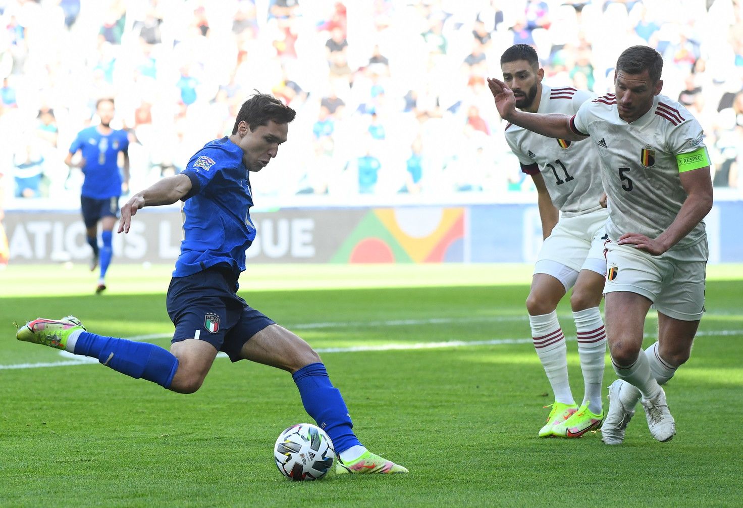 Mancini cambia trequarti del centrocampo dando spazio a Pellegrini e a Locatelli, schierato nel ruolo di regista centrale. In avanti, addio al falso nueve e spazio a Raspadori, piazzato tra Berardi, a destra, e a Chiesa dall’altra parte. In difesa, con Bonucci squalificato, c’è la coppia Acerbi-Bastoni. Martinez è senza il tridente pesante (De Bruyne-Lukaku-Hazard) e sposta Saelemaekers nel ruolo di una delle due mezze punte (l’altra è Vanaken) alle spalle di Batshuayi. I principi di gioco delle due squadre, aiutati da un limitato ricorso al pressing, sono simili: ricerca dell’uomo libero nei mezzi spazi e apertura sull’esterno. Chiesa nei primi due minuti sfiora il gol in un paio di occasioni, mentre dall’altra parte ci prova senza successo Batshuayi.