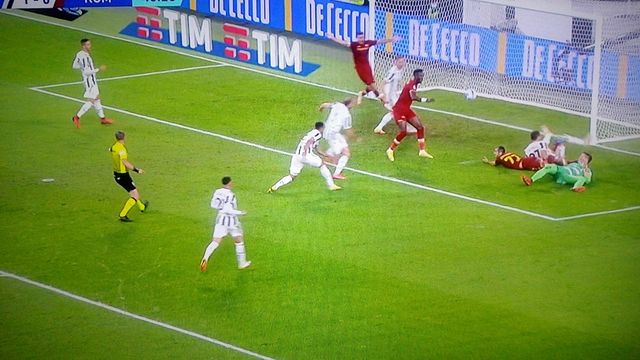 Juventus-Roma ad alta tensione a fine primo tempo: i giallorossi, sotto di una rete, entrano in area con Abraham che sembra toccare per Mkhitaryan (l'assistente Bindoni infatti segnala fuorigioco, poi smentito dal VAR) ma il tocco è di Danilo che quindi rimette in gioco l'armeno. Il giallorosso però non riesce a concludere, steso da Szczesny, così l'arbitro fischia rigore senza attendere un eventuale vantaggio che effettivamente arriva: il pallone finisce sui piedi di Abraham che segna una rete inutile visto che ormai era stato assegnato il penalty. Dal dischetto Veretout si fa poi parare il tiro dagli undici metri da Szczesny e Chiellini, già dentro l'area prima del tiro del francese, infine spazza in angolo.