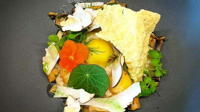 Ecco la preparazione del Pancotto alla Milanese con brodo di funghi, finferli, funghi porcini e tuorlo d’uovo cotto nel ghiaccio.