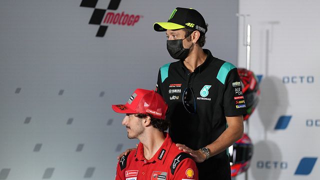 "Devo ringraziarlo per tutto il lavoro fatto con me e in generale con l'Academy. Ho avuto la fortuna di potermi allenare con lui. Oggi è una giornata dura, anche se sappiamo che doveva arrivare, nessuno si dimenticherà tutto quello che ha fatto". Francesco Bagnaia rende omaggio a Valentino Rossi nel corso della conferenza stampa in vista del GP della Comunità Valenciana, l'ultimo del 9 volte Campione del Mondo. "C'è una sensazione di tristezza, Vale è una leggenda delle moto. Mi ha ispirato, per me è stato un idolo come lo è stato per molti di noi. Dobbiamo congratularci con lui per la sua incredibile carriera", ha dichiarato il fresco campione del Mondo Fabio Quartararo.